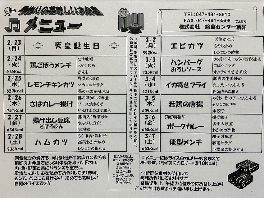 2月23日から3月7日のメニューです。